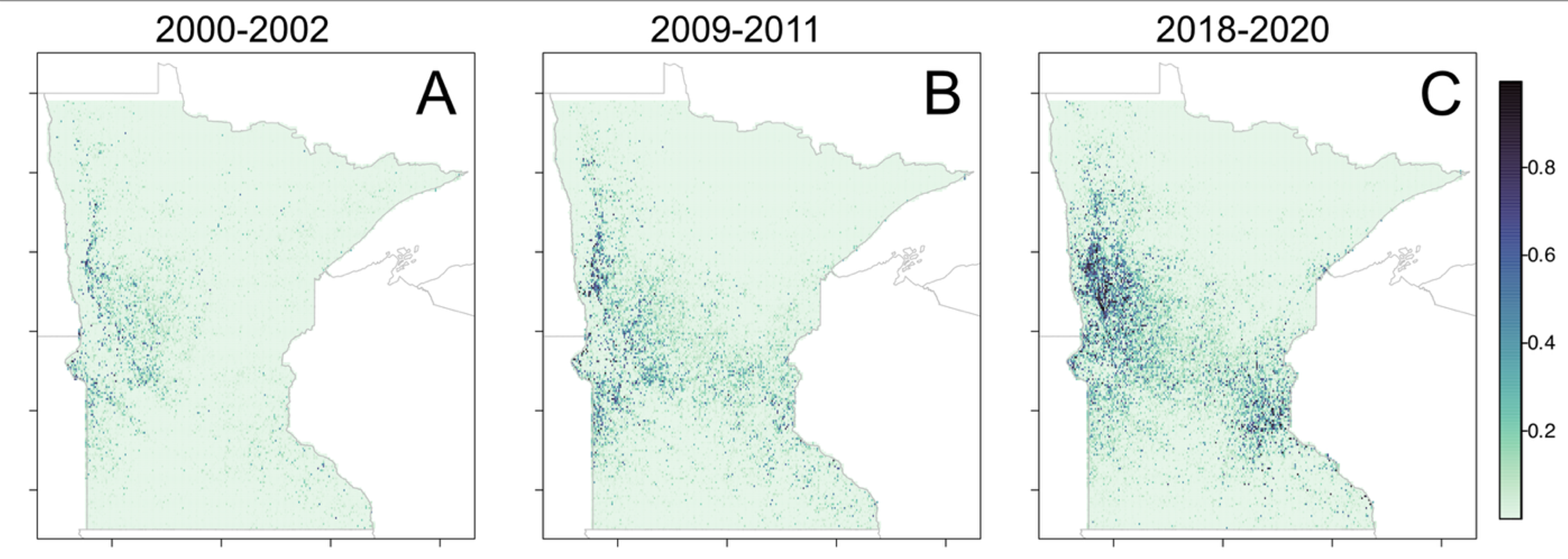 In the second phase of work, we expanded the spatial and temporal scale of remote sensing using a 21-year Landsat dataset. Here, the objective was to quantify changes in the spatial distribution and population dynamics of leafy spurge across the state of Minnesota. We showed that leafy spurge has expanded from 1,067 km² in 2000–2002 to 7,156 km² in 2018-2020, a 570% increase. Drought severity modulated the predicted area